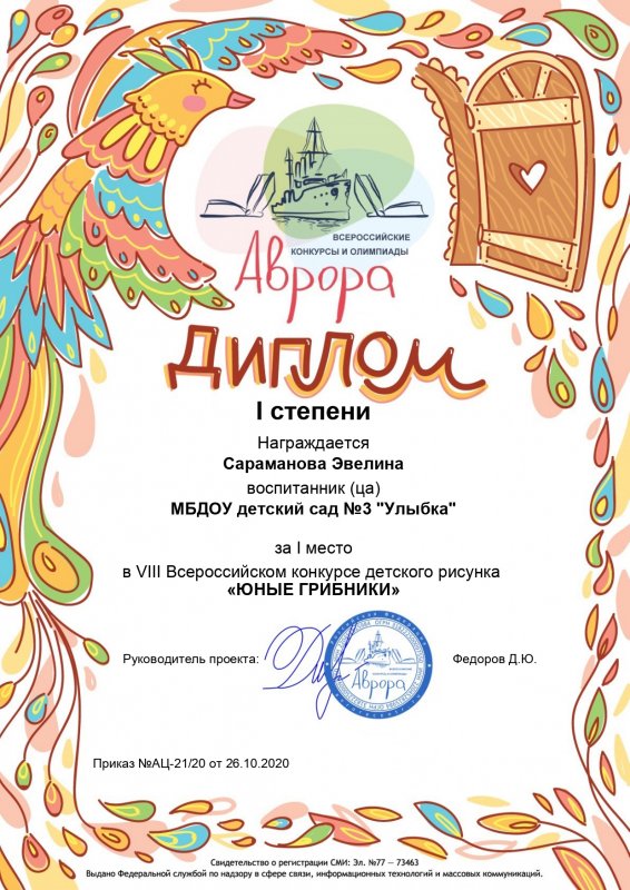 Воспитанники нашего сада приняли участие во Всероссийском конкурсе детского рисунка "Юные грибники". Ребята из всех возрастных групп представили яркие рисунки, использовали различные материалы и техники. В итоге их ждали призовые места в различных номинациях: 1 место Сараманова Эвелина, 2 место Квачева Софья, 3 место Квачева Ульяна и Афонин Дима. Поздравляем!