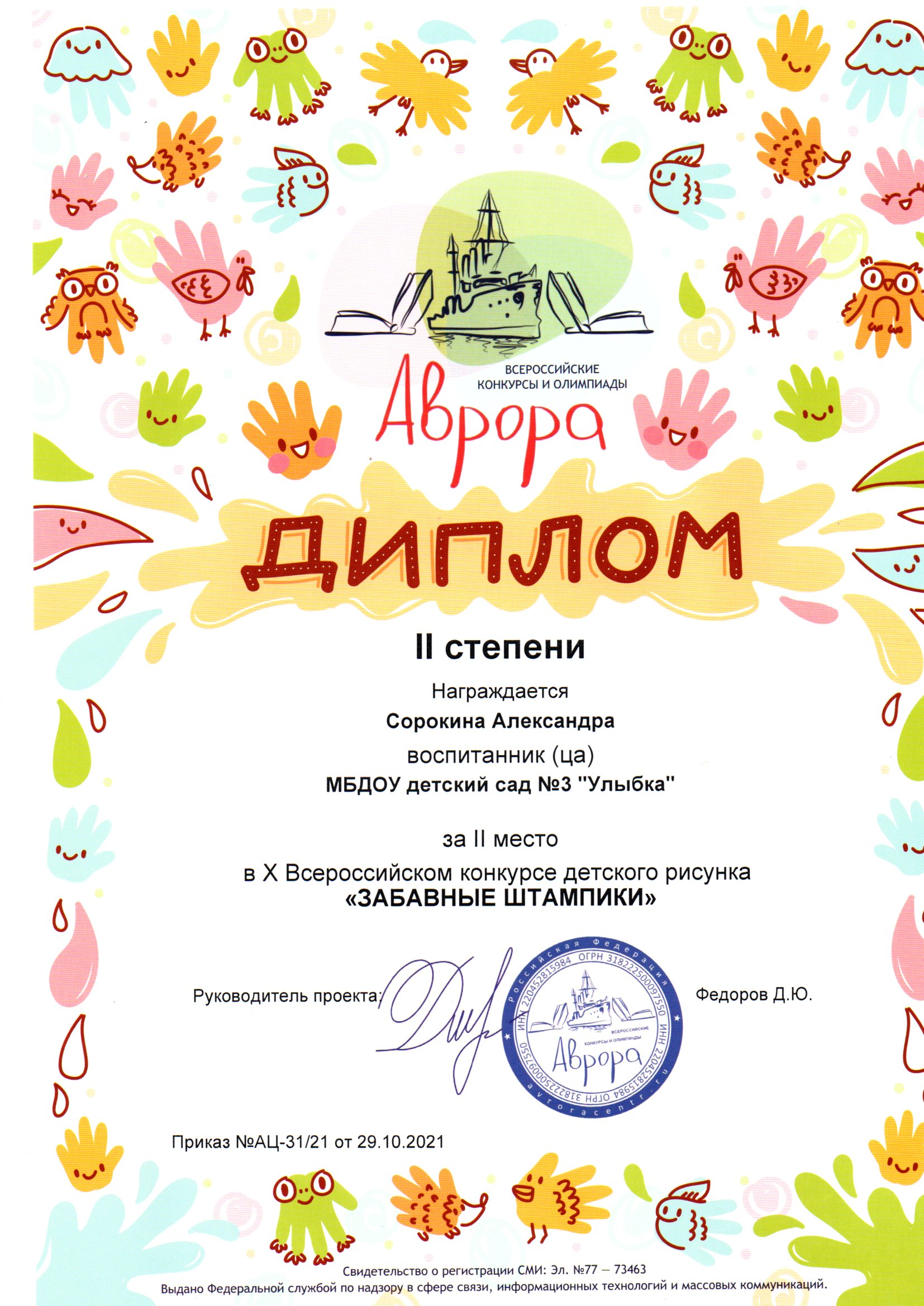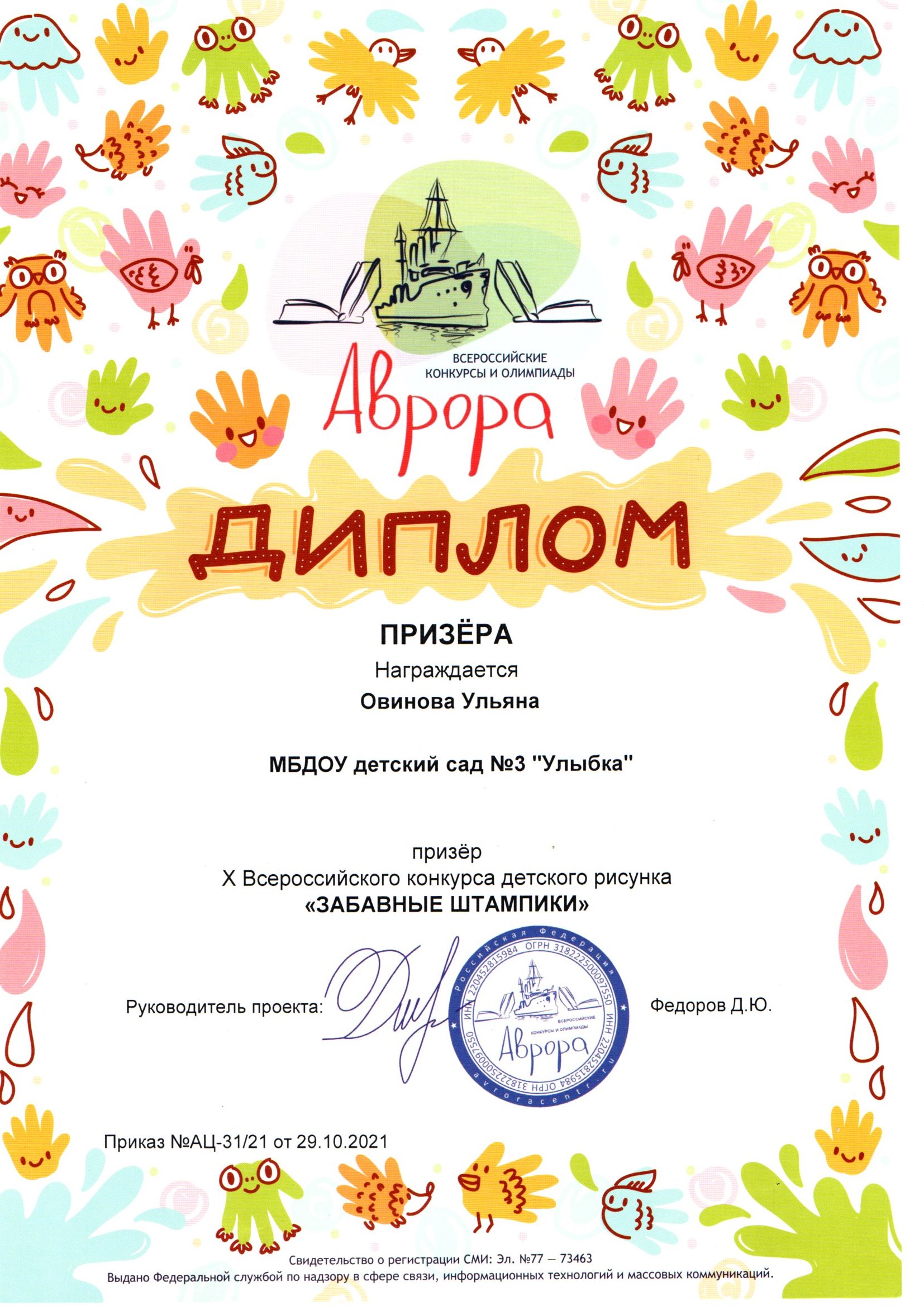 Воспитанники нашего детского сада приняли участие во Всероссийском конкурсе детского рисунка "Веселые штампики". Поздравляем с призовыми местами: Овинову Ульяну, Сараманову Эвелину, Сорокину Александру, Квачеву Софью, Квачеву Ульяну, Фокину Анастасию, Праздникова Тимофея, Сухарева Захара. Их работы оказались среди лучших рисунков в разных номинациях. Желаем дальнейших творческих успехов!