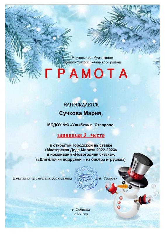Воспитанники нашего детского сада приняли участие в выставке "Мастерская Деда Мороза". Отправлено было 5 творческих работ. Поделка Сучковой Марии (средняя группа) " Для ёлочки подружки - из бисера игрушки" заняла 3 место в номинации "Новогодняя сказка". Поздравляем! Желаем дальнейших творческих успехов!